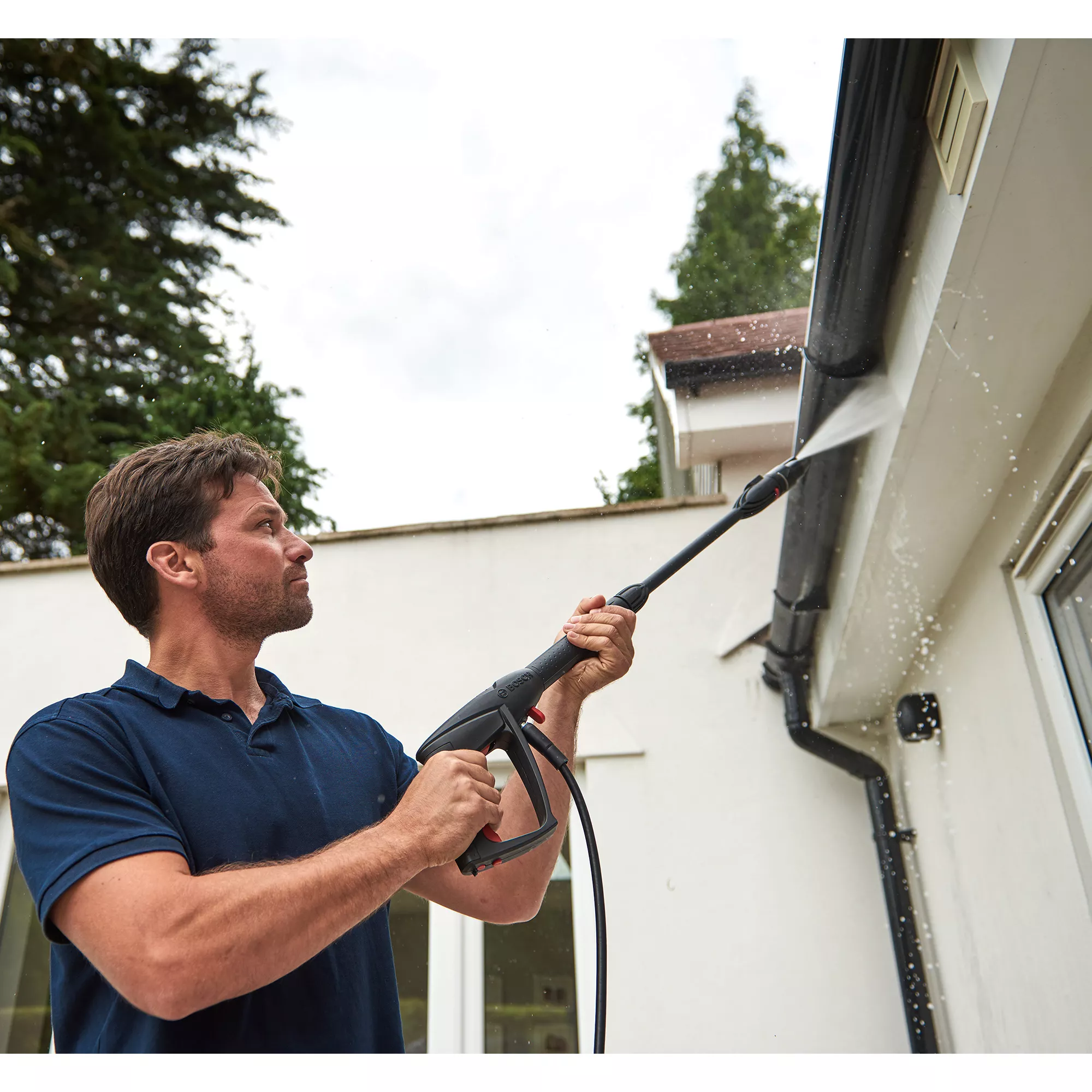 Save time cleaning cars with the 450-ml High-Pressure Detergent Nozzle. The extendable handle and large wheels offer increased mobility and easy storage. A quieter motor pump increases comfort when cleaning. Push-fit connections and in-use gun storage make cleaning simple.