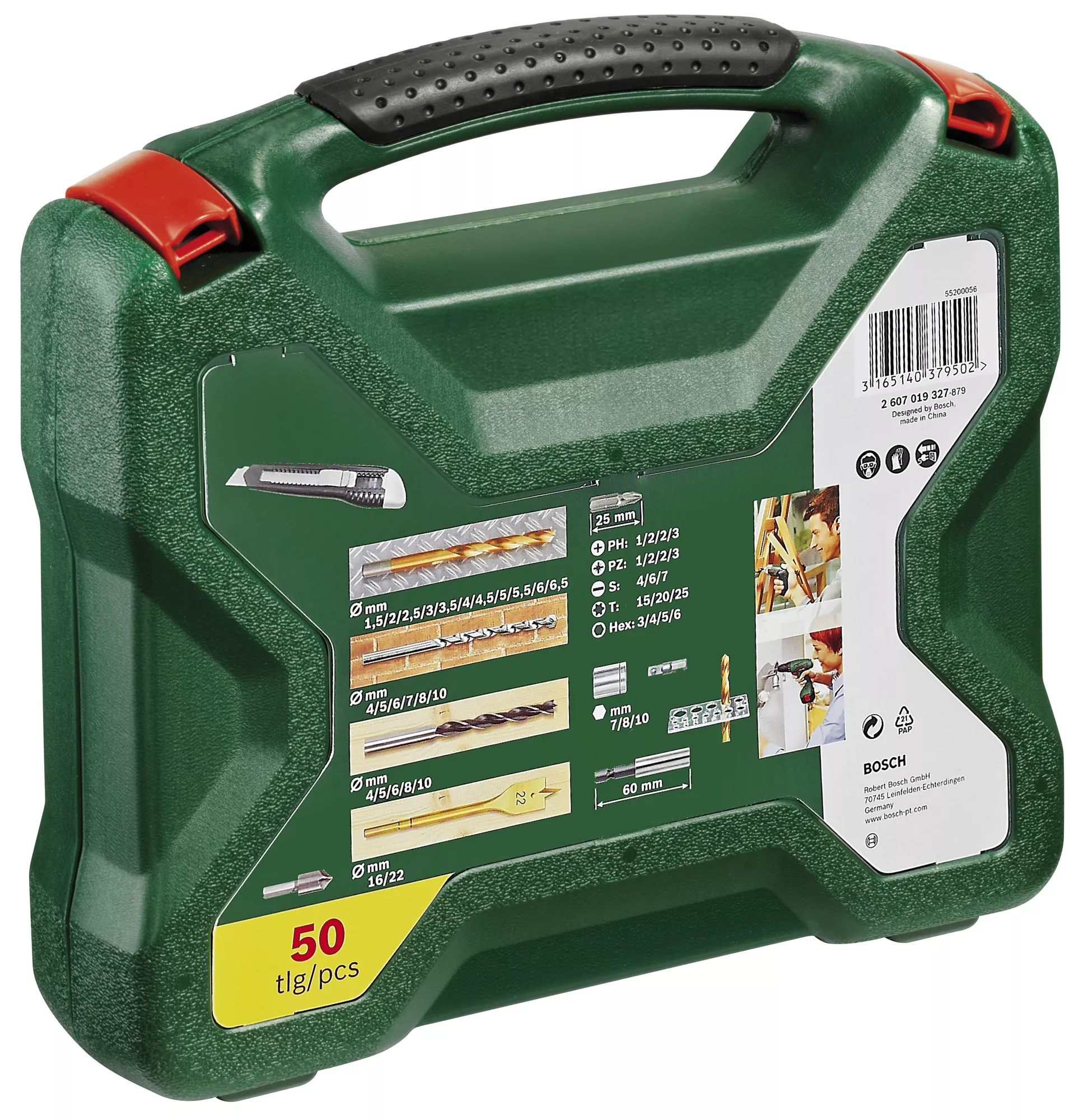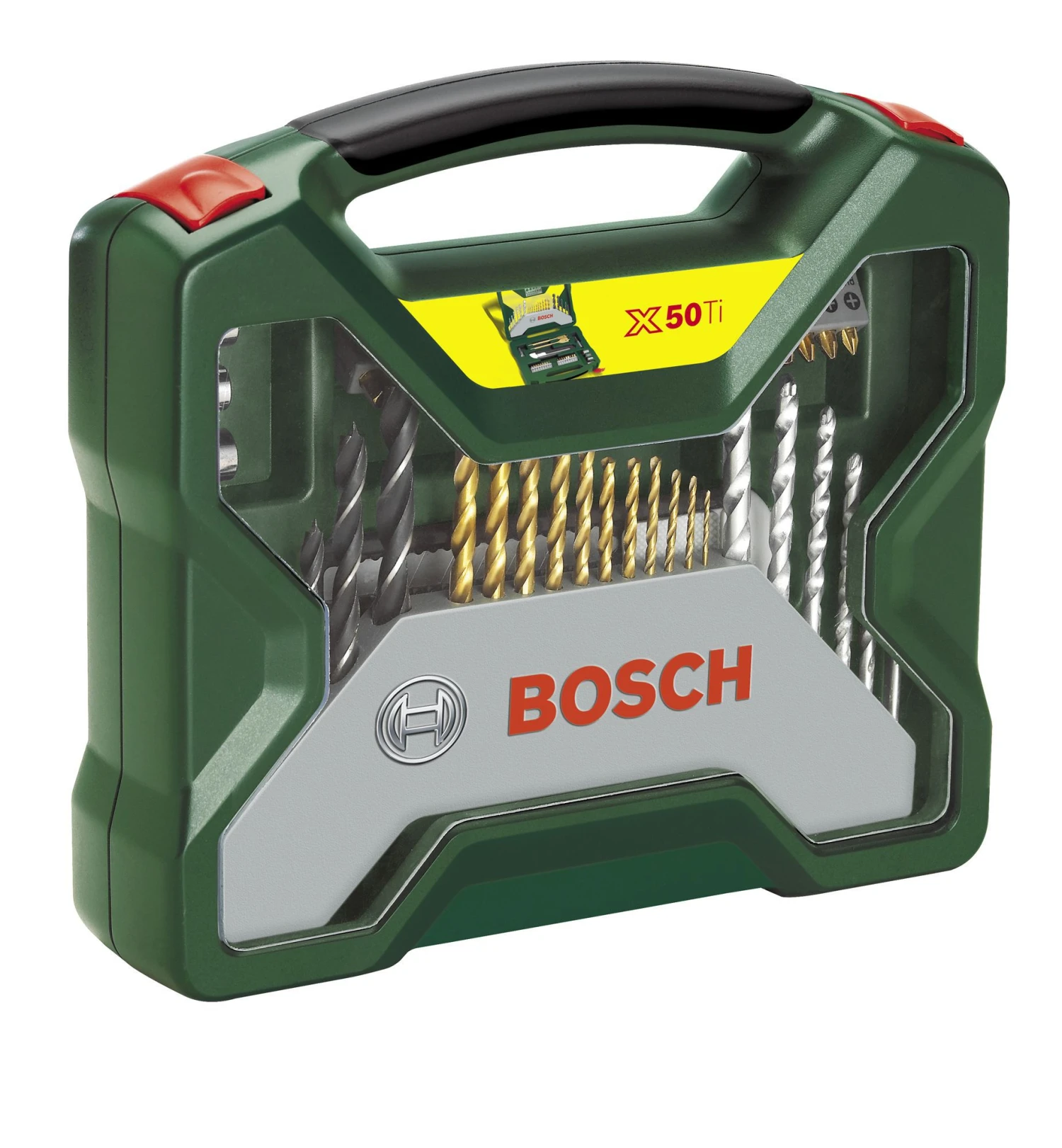 This Bosch titanium drill bit accessory set comes with 50 pieces, and organised in a hardened plastic case.