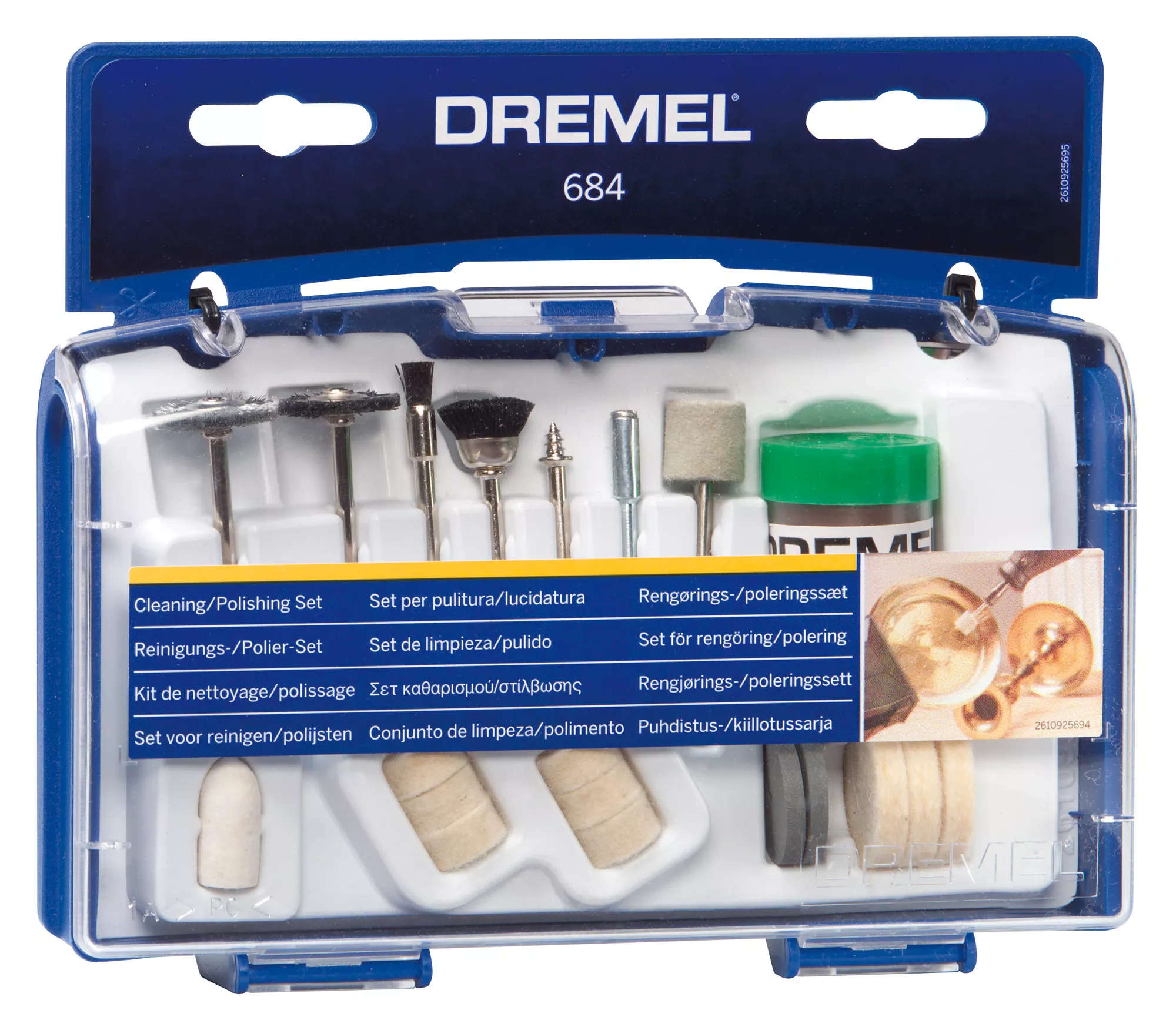 This Dremel polishing kit is for polishing corrosive-resistant materials and cleaning hard to reach areas. It is compatible with rotary tools.