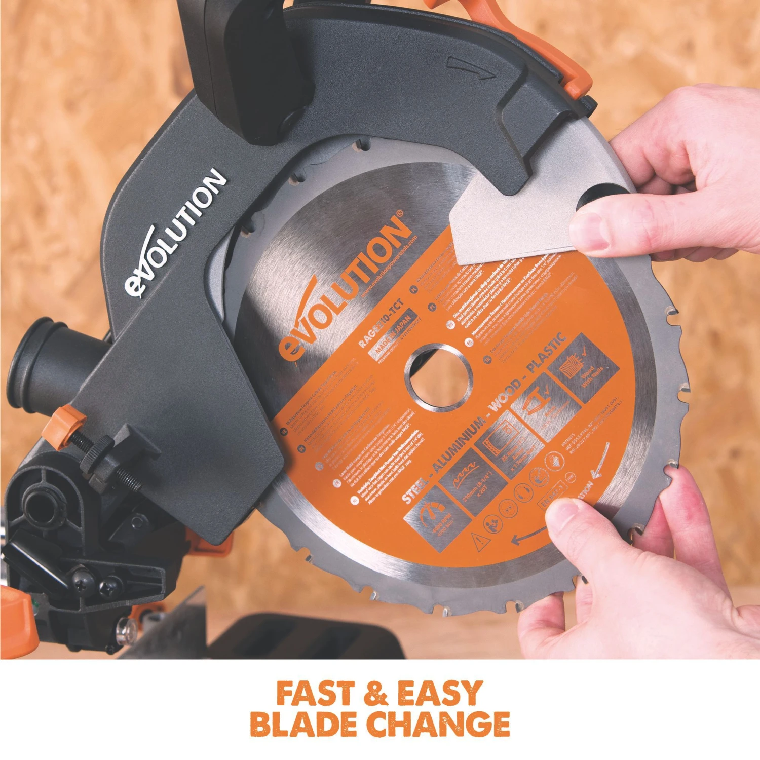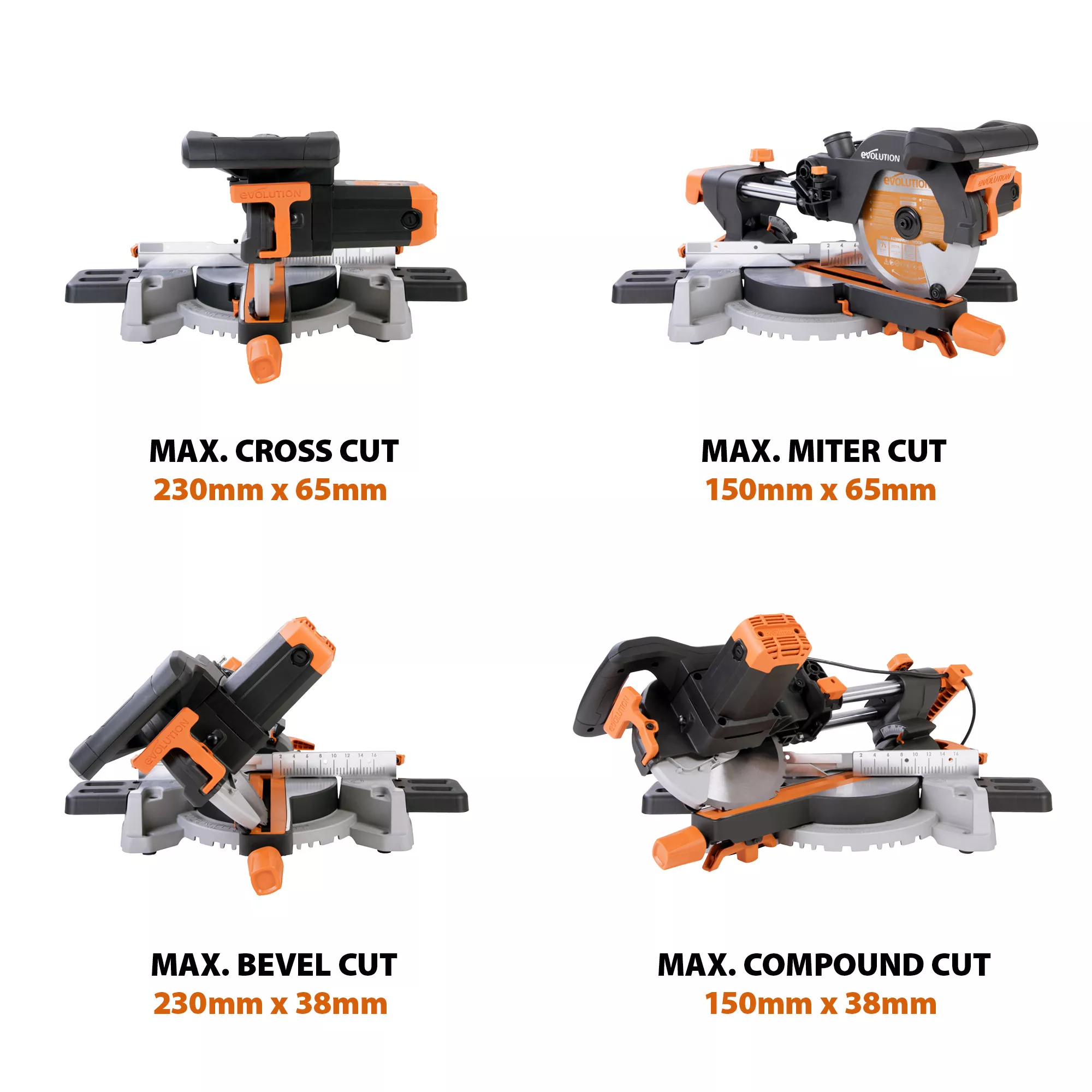 The Evolution R210SMS is a high powered 210mm TCT Multi-Material cutting Compound Sliding Mitre Saw optimised with patented Multi-Material Technology to cut mild steel, non-ferrous metals, wood and even wood with embedded nails and plastic, with a single blade. With an impressive maximum cross cut of 230 x 65mm, maximum 50 degree mitre and a powerful 1500W motor, the R210SMS provides clean and precise cuts no matter the material. The integrated laser cutting guide and positive bevel stops provide maximum accuracy with every cut, and a durable die-cast aluminium base supports a variety of heavy duty materials with ease. Safety features include a lock-off switch and a spindle lock for easy blade changes. Over-moulded, in-line handle improves ergonomics and comfort, and on-board tool storage allows for convenient storage of the blade change hex key.