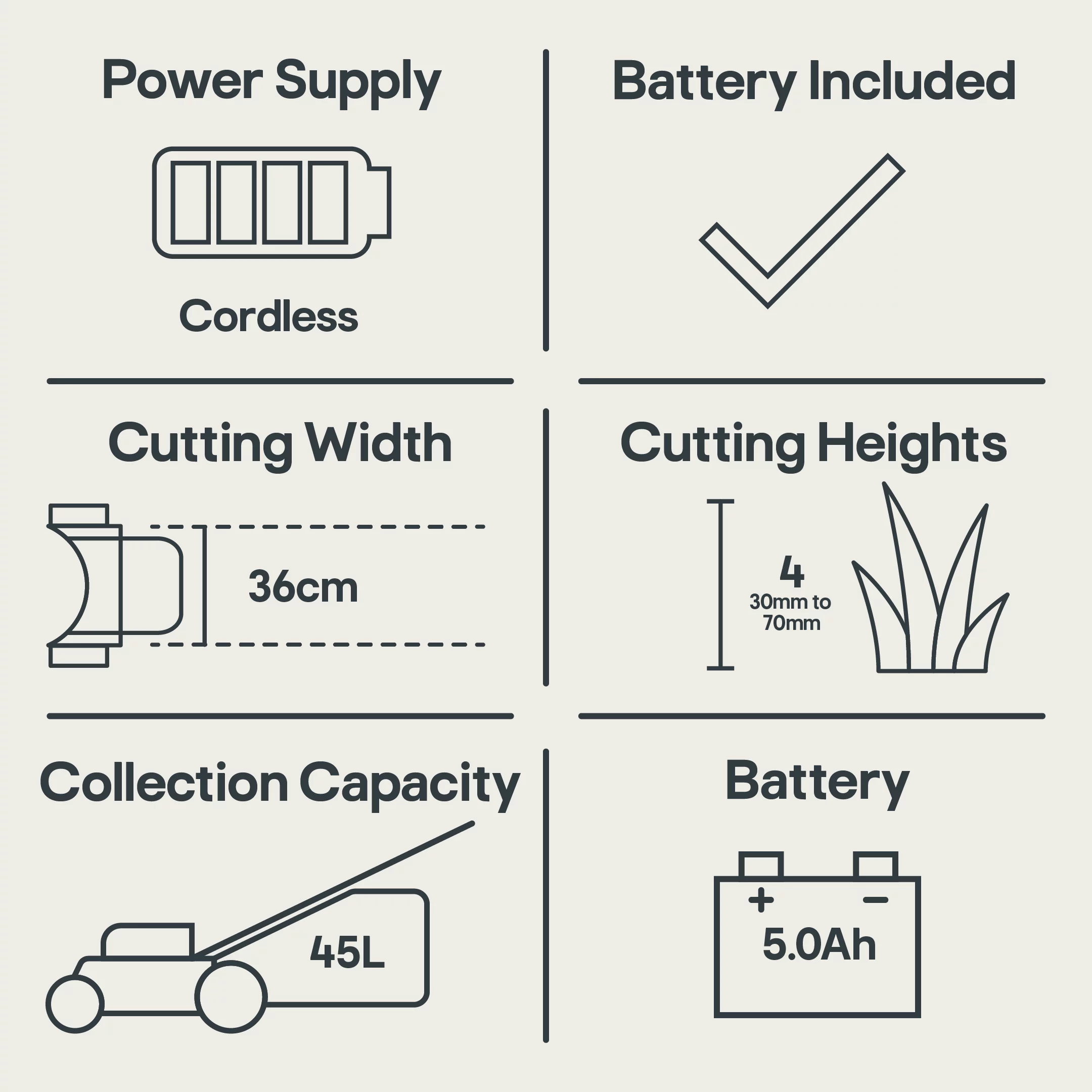 - The perfect cut every time – this mower’s 36cm cutting path gives you plenty of manoeuvrability for the perfect cut every time