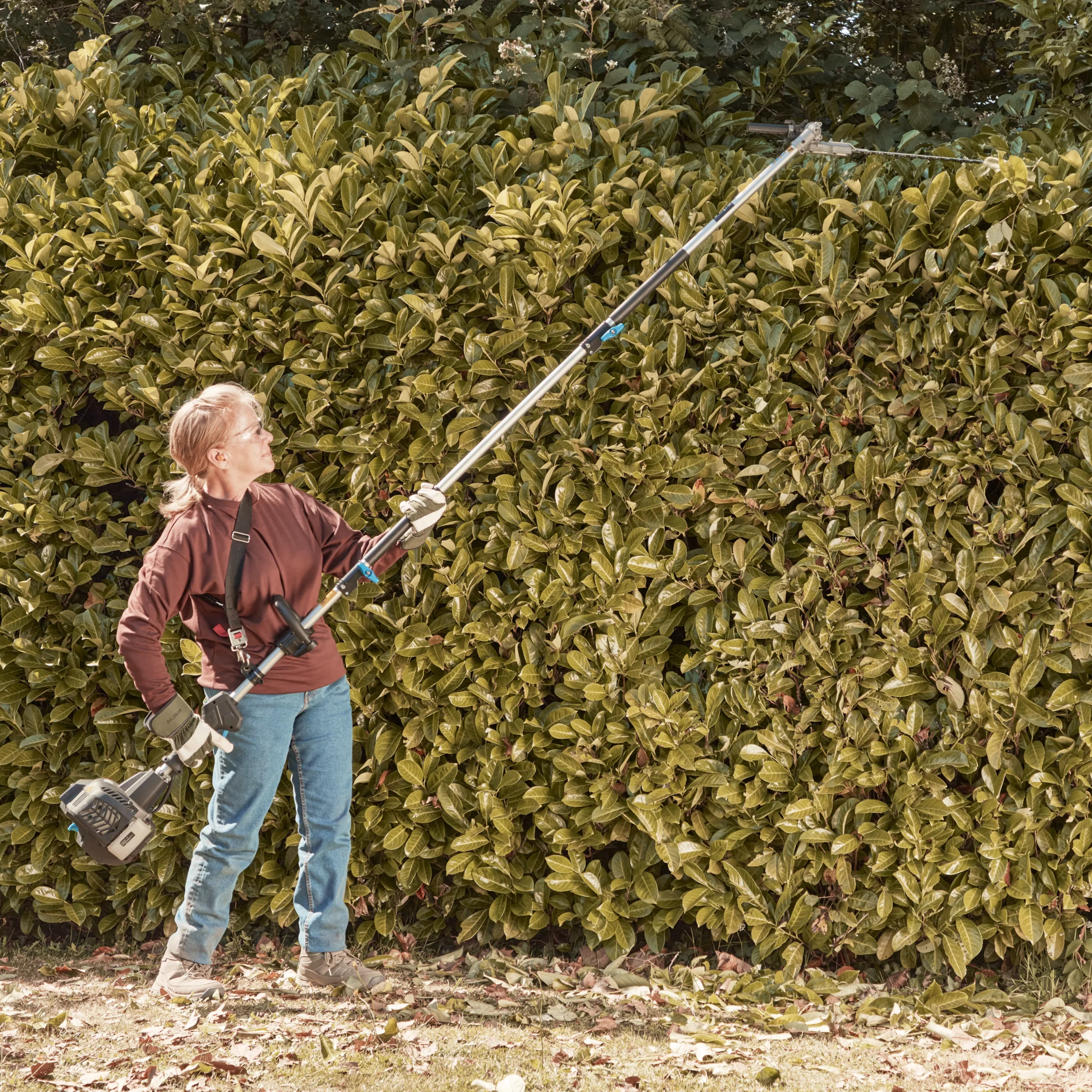 - Hedge trimmer head with 150 degree cutting angle adjustable to ensure neat cutting and shaping