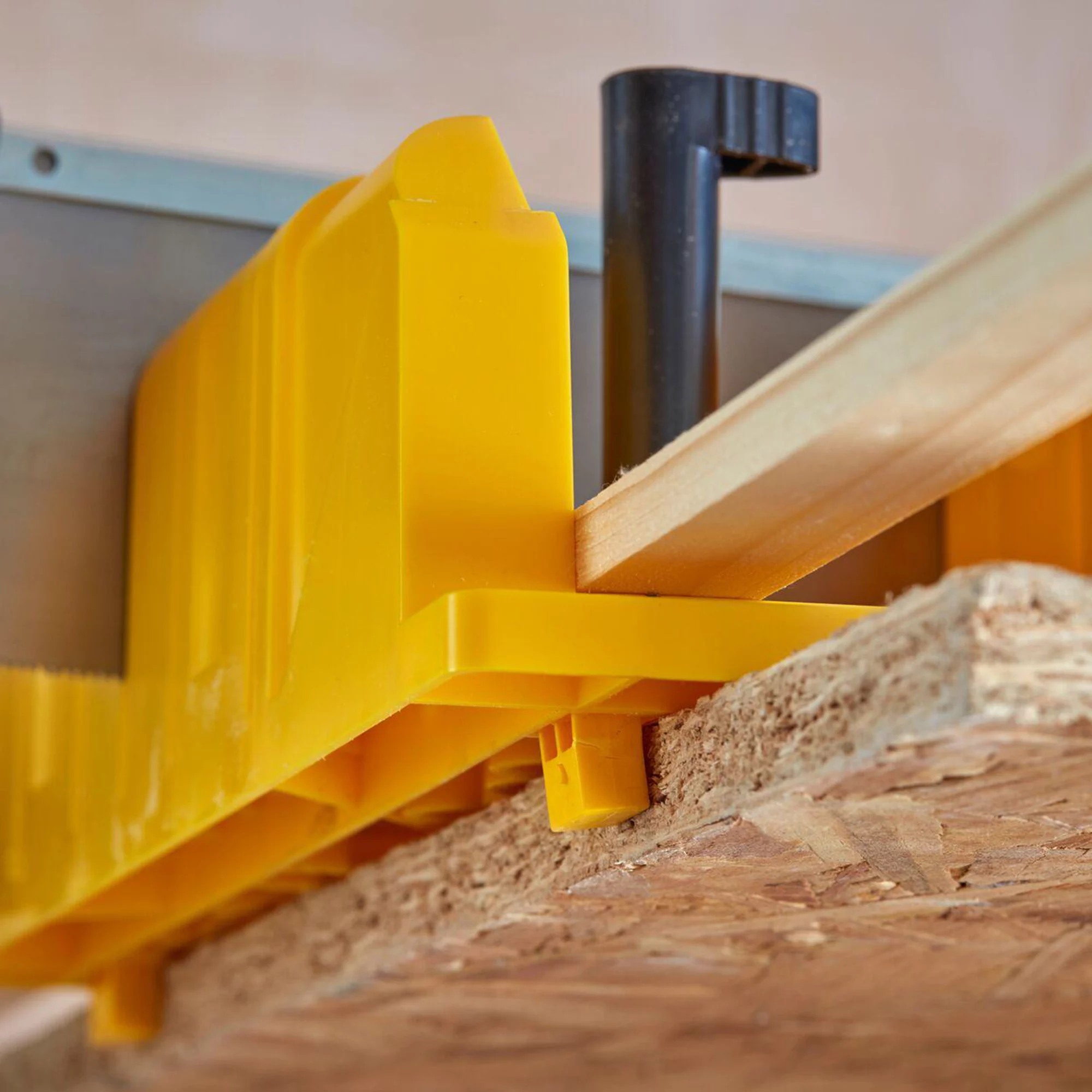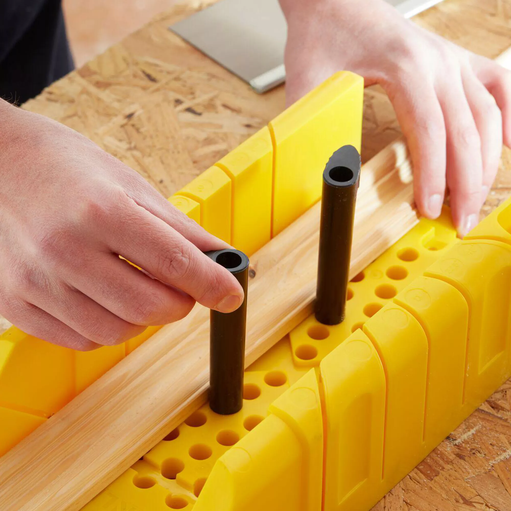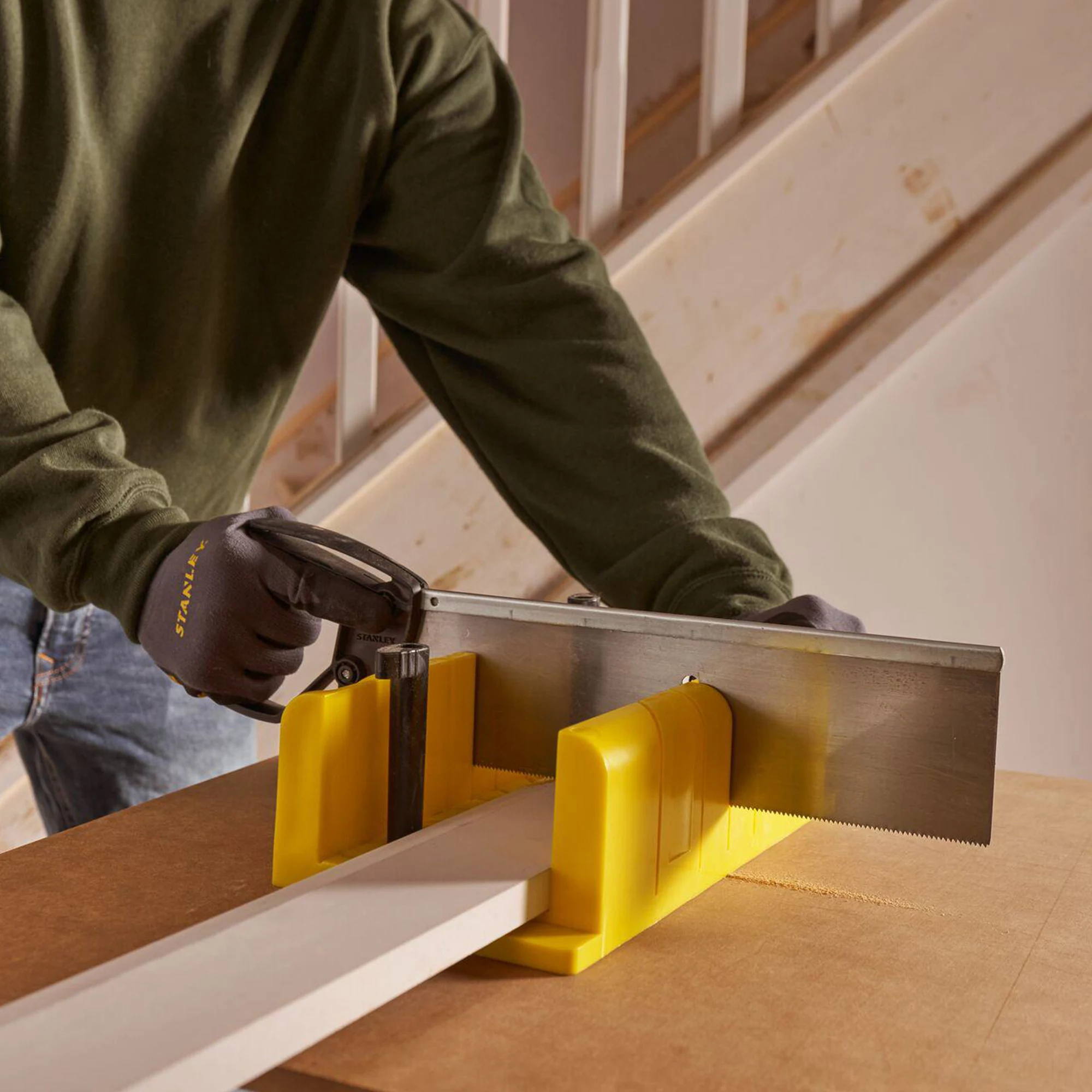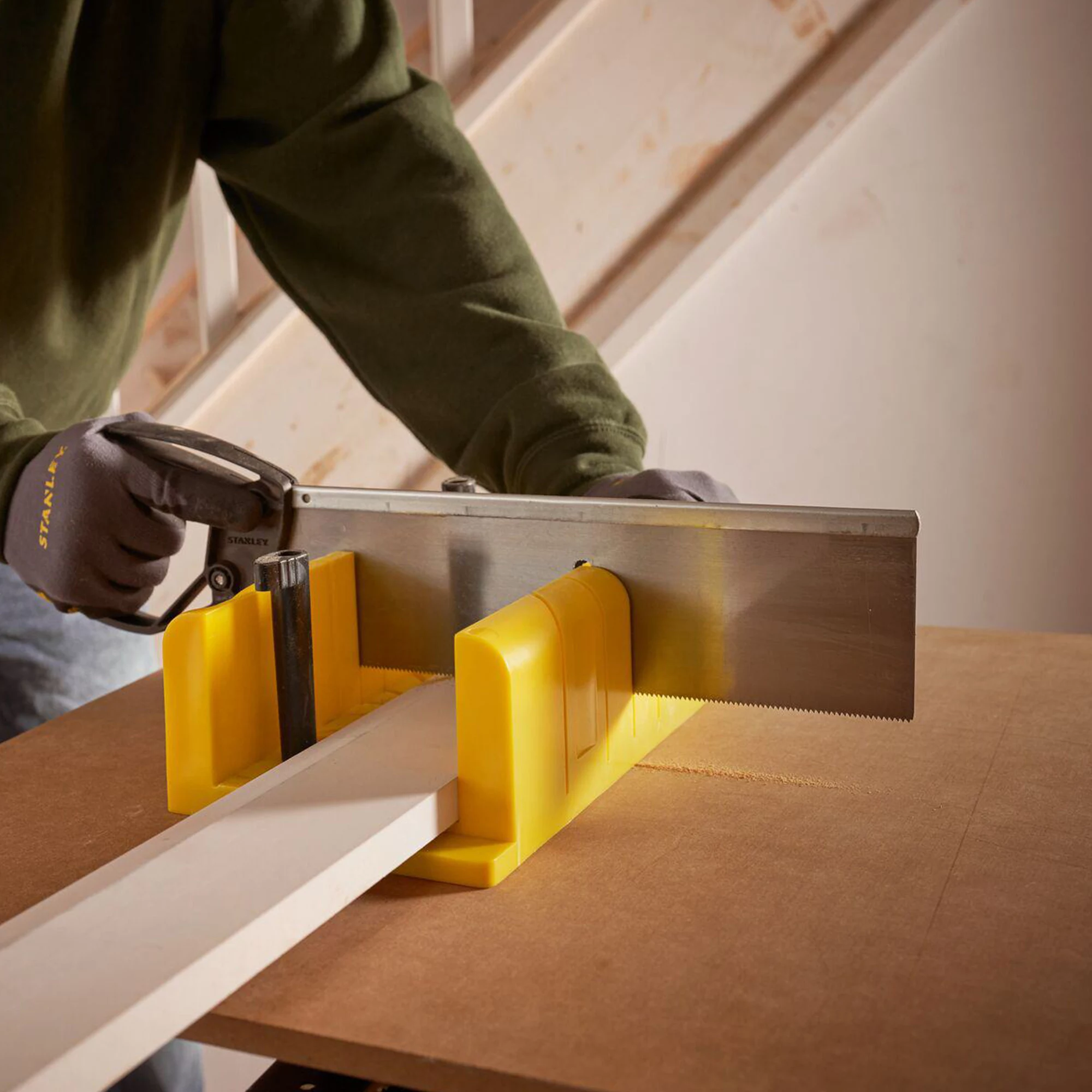 The Stanley mitre box features 90° and 45° mitre slots as well as 22.5° slots for octagon shapes. Rubber feet help hold the unit in place and prevents box slippage.