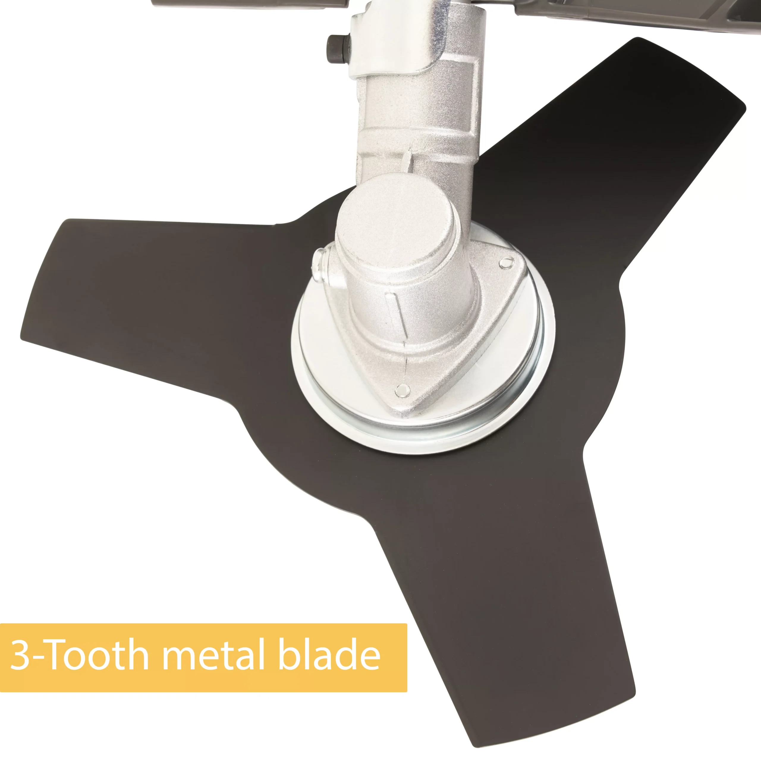 - 3-Tooth metal blade Ideal for cutting coarser vegetation from dense bushes and tall grass to shrub areas